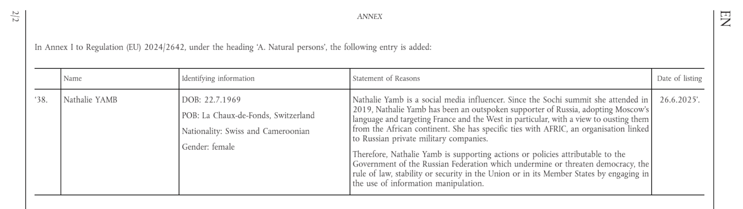 - Sanctioned by the EU: Nathalie Yamb, the first Swiss Citizen to be included on the sanctions list