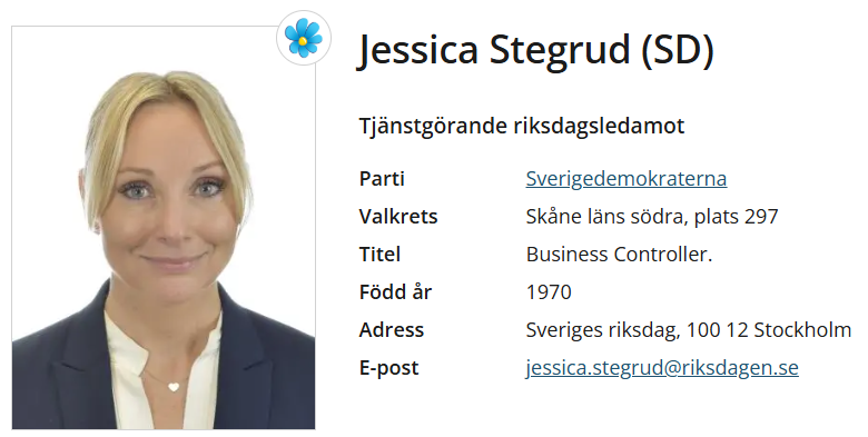 Jag har träffat Jessica Stegrud. Hon är välutbildad, kunnig och har stor erfarenhet, även utanför riksdagen. Hon är vänlig och en bra människa. Jag har ett stort förtroende för henne.