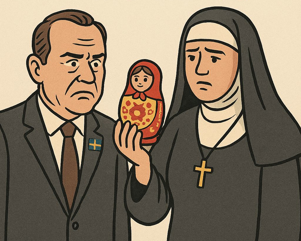 I Sverige har vi nått den punkt där inte ens nunnor från Minsk – kvinnor som säljer babuskor och ber för människors själar – längre betraktas som religiösa väsen, utan som misstänkta logistiska chefer i Kremls globala dock-diplomati.