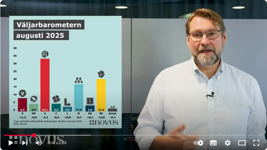 Moderaterna (M) backar för fjärde månaden i rad. I mars hade M 20,3 %. Nu i augusti 17,6 %.