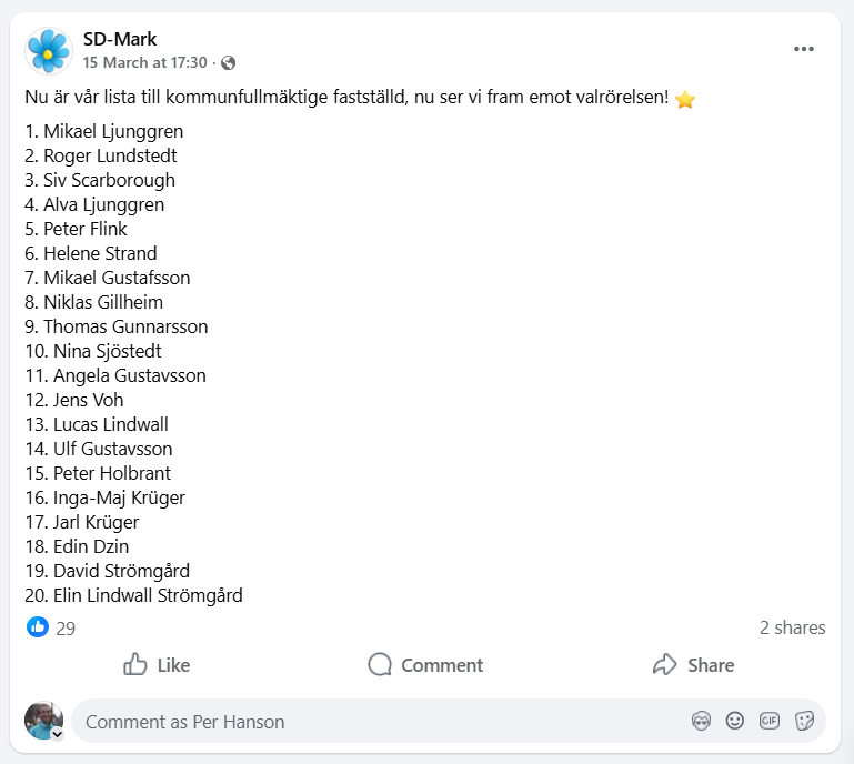 Nu är Sverigedemokraternas lista till kommunfullmäktige i Marks kommun fastställd.