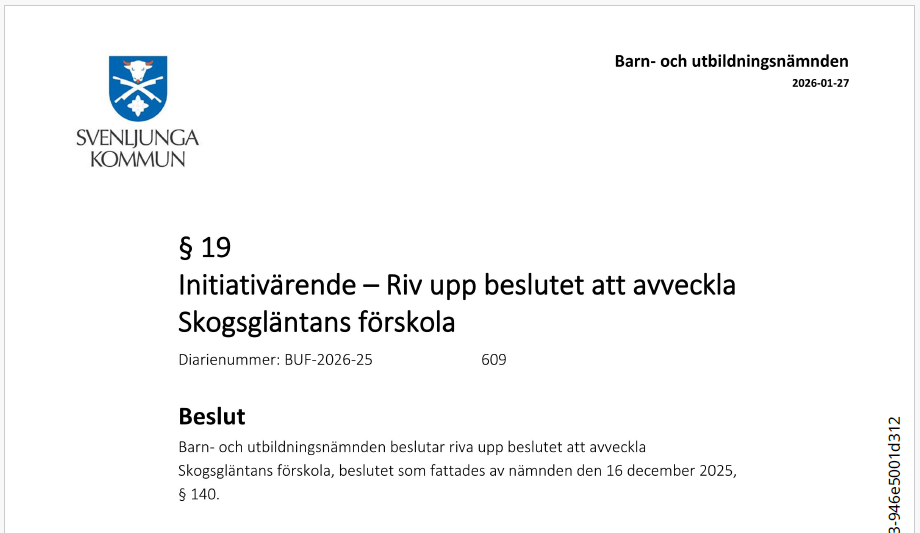 - Protokoll från Kommunfullmäktiges sammanträde den 18 december 2025 - § 132 Beslut: Svenljungaförslaget (Medborgarförslag), ”Lägg inte ner Skogsgläntans förskola”, remmiteras till Barn- och utbildningsnämnden för beredning och beslut.