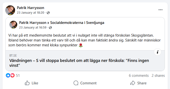 - Borås Tidning: Vändningen – S vill stoppa beslutet om att lägga ner förskola: ”Finns ingen vinst” - 2026-01-23